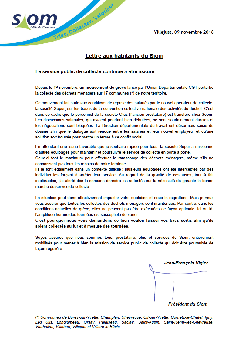 Le service public de collecte continue à être assuré.Depuis le 1er novembre, un mouvement de grève lancé par l’Union Départementale CGT perturbela collecte des déchets ménagers sur 17 communes (*) de notre territoire (...)
